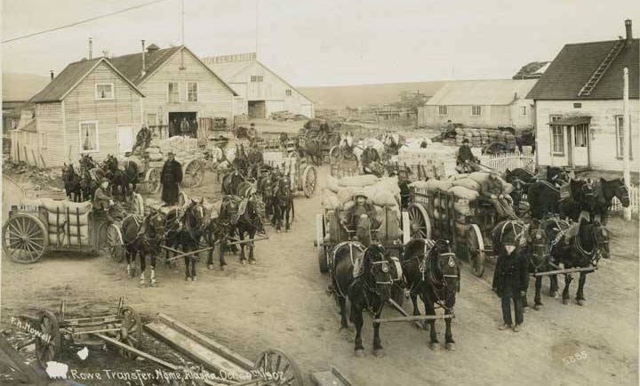 In the photo below from Nome, the sign across the top of the large barn in the background reads “…Transfer Co. A. H. Moore,” while lettering on the wagon in front and at the bottom of the photo is of the W. J. Rowe Transfer and Freighting Company.