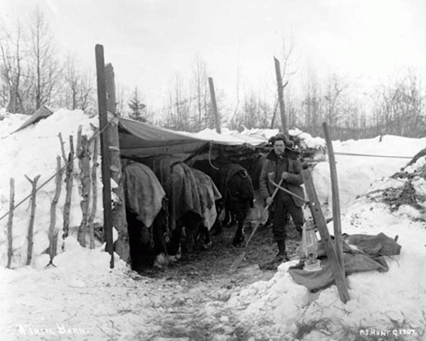 The first shelters for animals in Alaska were likely the small crudely-built dog barns found at many trailside roadhouses for the passenger, freight, and mail dog teams which traveled the winter trails.