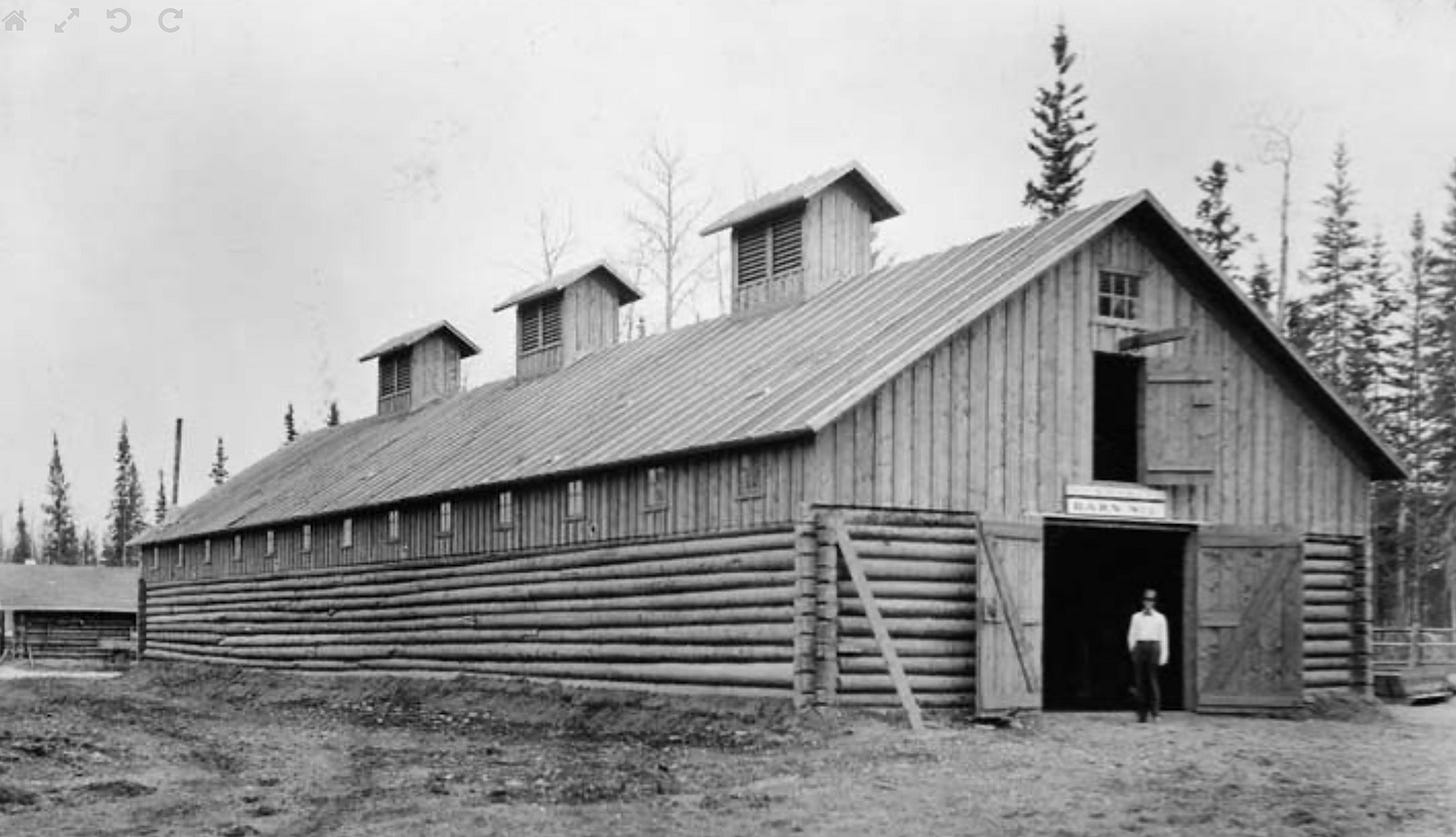 When the federal government built the Alaska Railroad, between 1902 to 1923, several large barns were built by the Alaska Engineering Commission for the stock which hauled freight, provided access and transportation, and served many other purposes in the construction project. Huge structures of log and frame were raised in Anchorage, Nenana, Fairbanks and other locations along the 500 mile route.