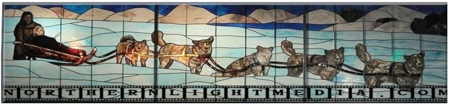 One of my first website headers featuring the 1910-era stained glass dog team which I discovered while researching the history of sled dogs in 2007. I wrote a book, The Stained Glass Dog Team, about the search for its origin and the gold rush history of Seattle, Alaska, the Arctic Club, and much more.